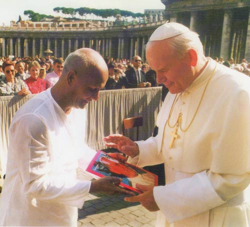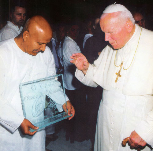 Sri Chinmoy met Pope John Paul II five times between 1980 and 1998. These meetings were recorded in the book Pope John Paul II - God's heart-prize winner. 1